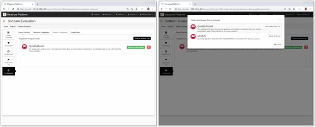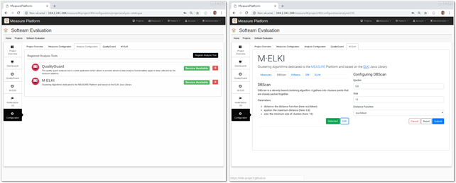 Once deployed, the M·ELKI analysis tool automatically registered itself on the MEASURE Platform. However, it remains to the users to apply M·ELKI to their targeted projects. The following pictures show how to do such a registration: it is straightforward as users only have to select the M·ELKI tool.